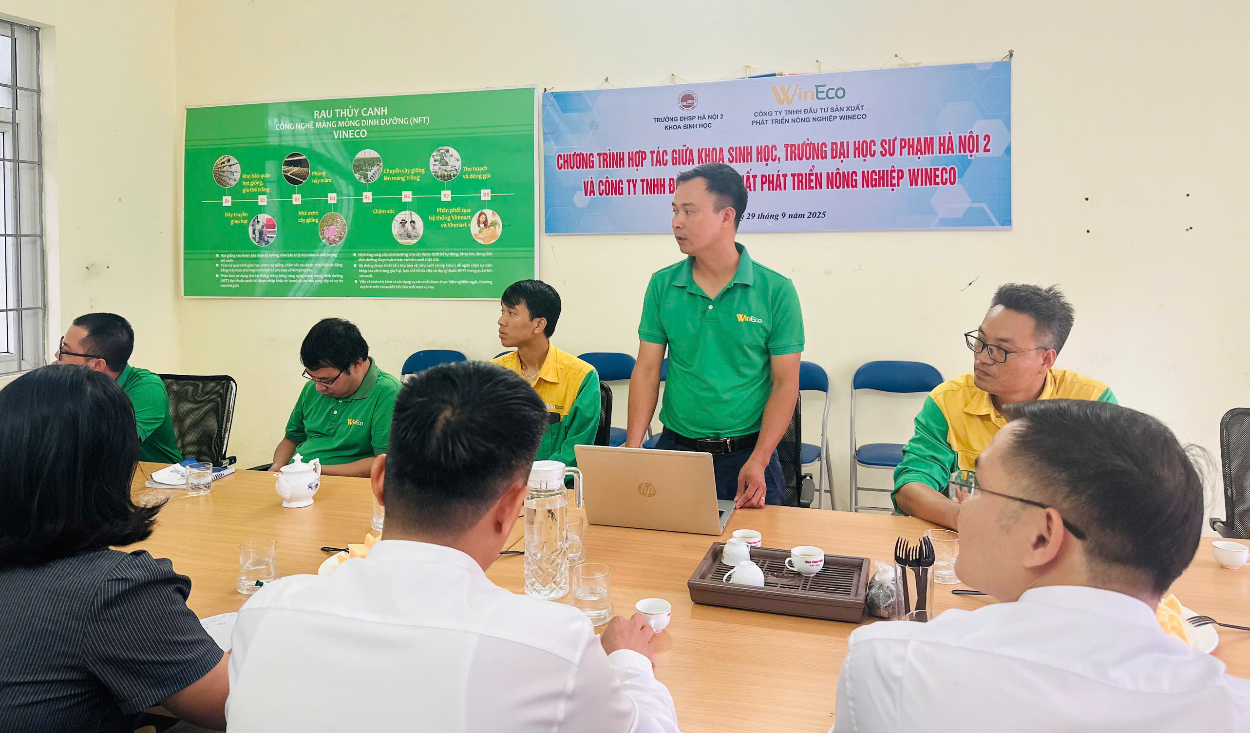 Về phía khoa Sinh học, PGS.TS. Nguyễn Xuân Thành đã giới thiệu tổng quan về quá trình phát triển và định hướng đào tạo của Khoa, đặc biệt nhấn mạnh đến ngành Công nghệ sinh học. PGS. Thành khẳng định “Nông nghiệp công nghệ cao” là một trong ba trụ cột đào tạo trọng tâm, dựa trên thế mạnh truyền thống và đội ngũ giảng viên hiện tại. Thầy bày tỏ mong muốn Công ty WinEco không chỉ hỗ trợ tiếp nhận sinh viên thực tập, rèn nghề mà còn đồng hành trong việc xây dựng, hoàn thiện chương trình đào tạo, giúp hoạt động giảng dạy gắn kết chặt chẽ hơn với nhu cầu thực tiễn doanh nghiệp.