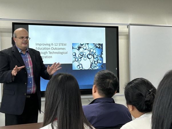 Tại buổi seminar, GS. Alandeon W. Oliveira chia sẻ về chủ đề “Improving K-12 STEM Education Outcomes through Technological Integration”. Báo cáo mở đầu bằng việc khái quát vai trò của công nghệ trong giáo dục hiện đại. Sự phát triển mạnh mẽ của các thiết bị kỹ thuật số, phần mềm mô phỏng, nền tảng học tập trực tuyến và công cụ đa phương tiện đã mở ra cơ hội lớn cho giáo dục STEM. Trong đó, yếu tố âm thanh – thường bị xem là “phụ trợ” – thực chất lại có tác động sâu sắc đến trải nghiệm học tập. Khi được tích hợp một cách có chủ đích, âm thanh có thể điều hướng cảm xúc, khơi gợi sự tò mò, và tạo điều kiện để học sinh kết nối thông tin với trải nghiệm cá nhân. Việc sử dụng hợp lý các hiệu ứng âm thanh trong video, trò chơi học tập, hay mô phỏng thí nghiệm ảo giúp học sinh cảm nhận rõ hơn về hiện tượng khoa học, từ đó nâng cao mức độ tương tác và hứng thú học tập. Giáo sư đã đưa ra nhiều ví dụ cụ thể minh họa cho hiệu quả của âm thanh trong lớp học STEM. Đối với sinh học, âm thanh tự nhiên – tiếng nước chảy, tiếng động vật, hay âm thanh của môi trường sống – góp phần giúp học sinh tiếp cận kiến thức theo hướng cảm quan và gần gũi với thực tế hơn.