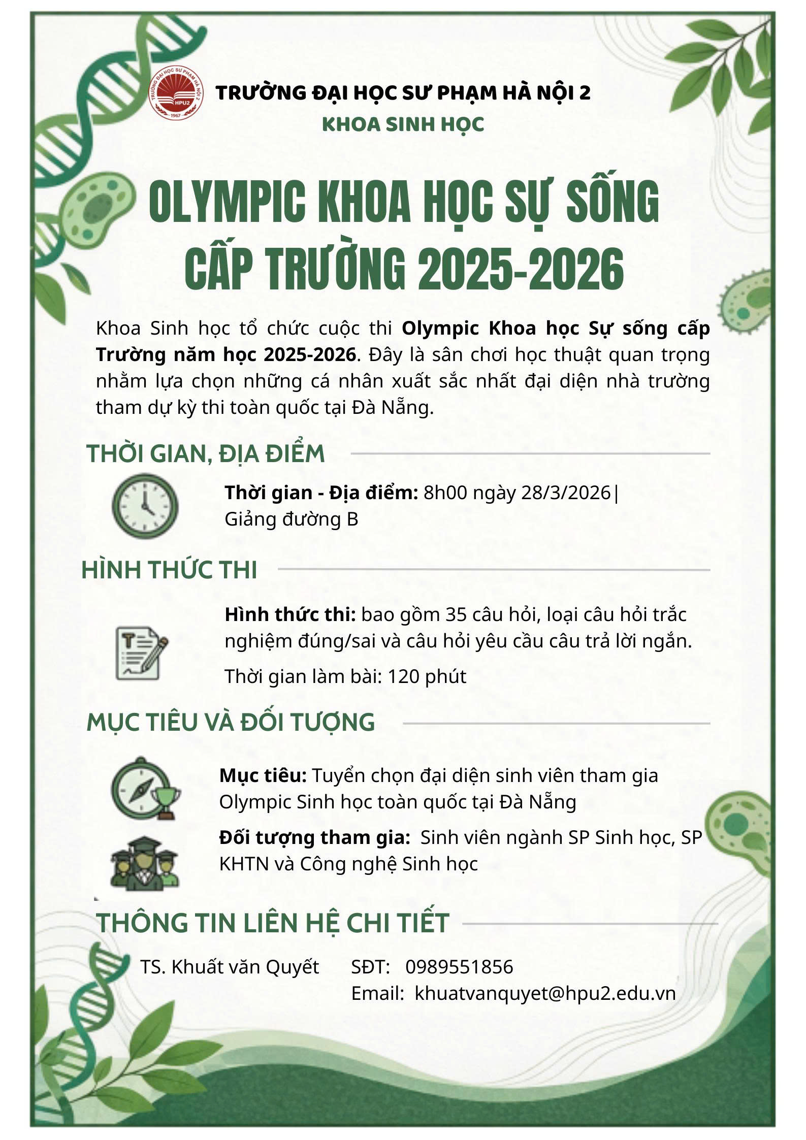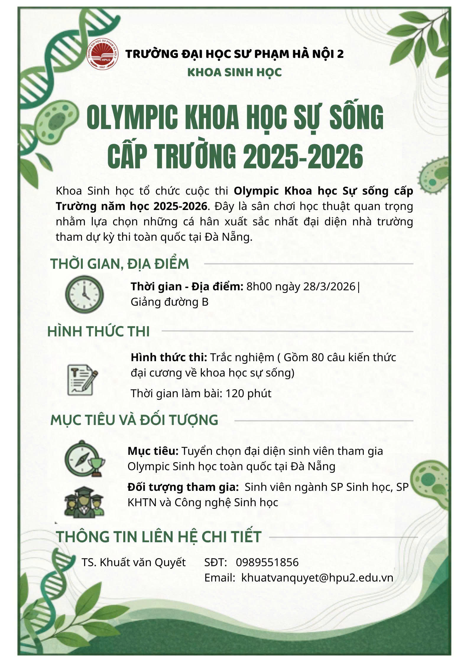 Thông báo: Cuộc thi Olympic Khoa học sự sống cấp Trường, năm học 2025-2026