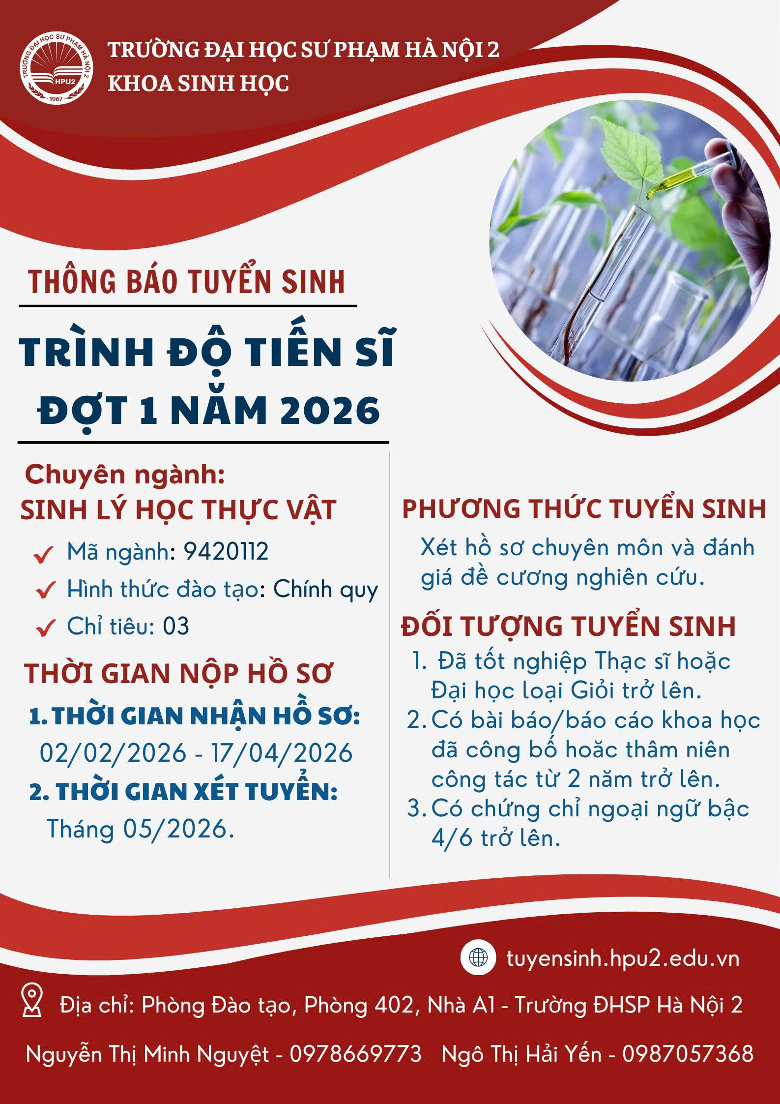 Thông báo tuyển sinh trình độ đào tạo Tiến sĩ đợt 1 năm 2026 - Chuyên ngành: Sinh lý học Thực vật
