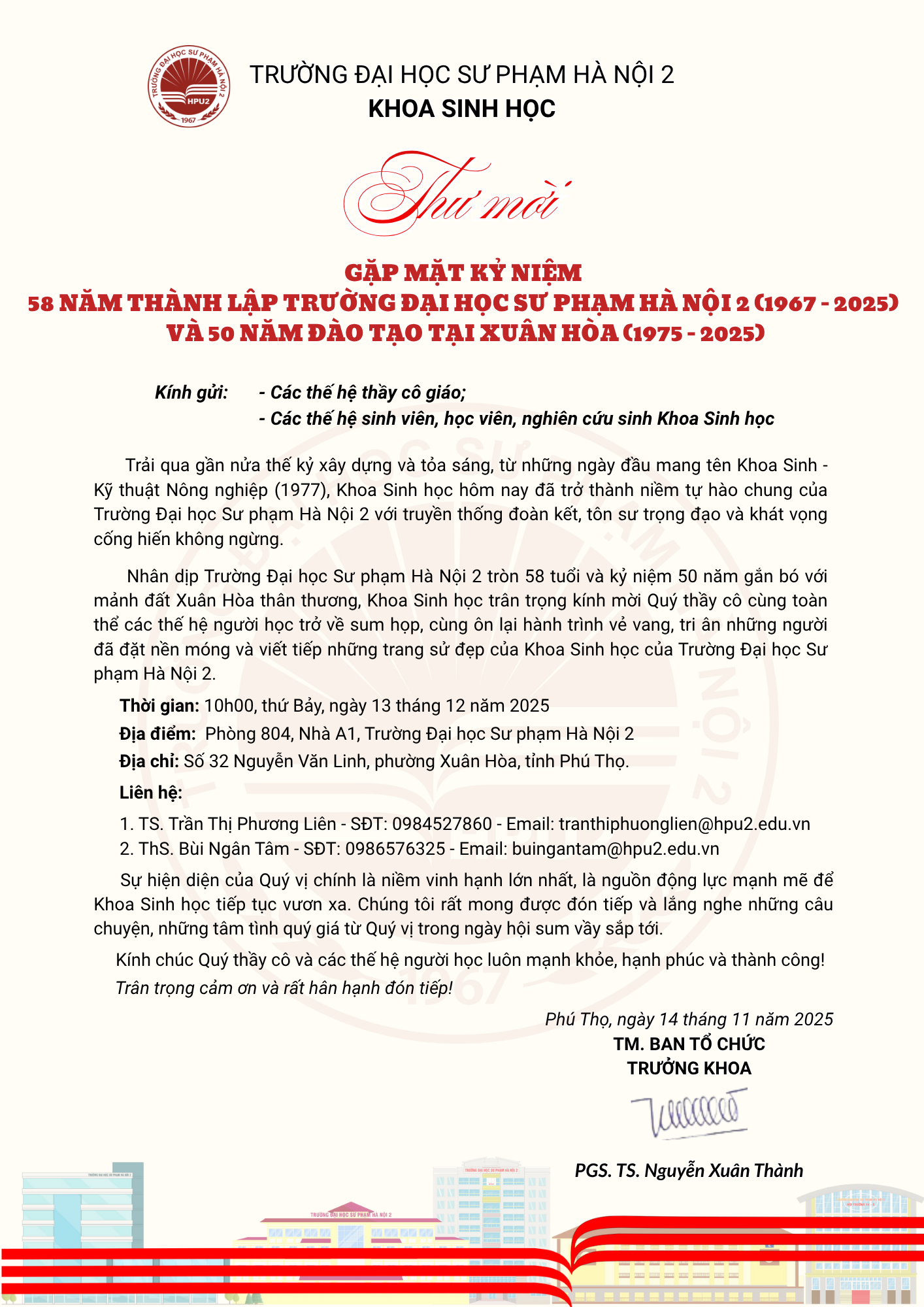 Khoa Sinh học trân trọng kính mời các thế hệ thầy cô giáo; các thế hệ sinh viên, học viên, nghiên cứu sinh về tham dự buổi gặp mặt truyền thống nhân dịp đặc biệt này – một dấu mốc ý nghĩa trong hành trình phát triển, cống hiến và trưởng thành của Khoa.
